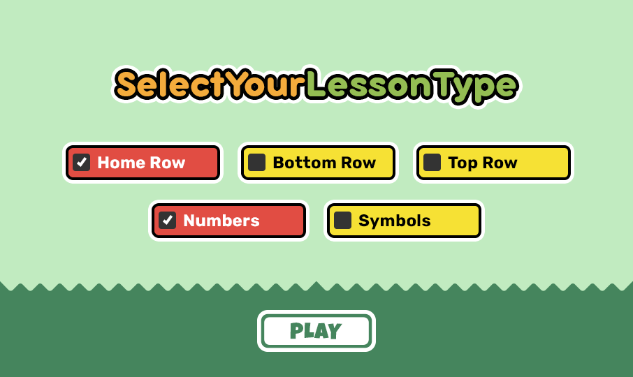 - Choose the type of lesson to practice. Select one of the Home Row, Top Row, Bottom Row, Numbers, or Symbols options. Alternatively select multiple rows to increase the challenge level.