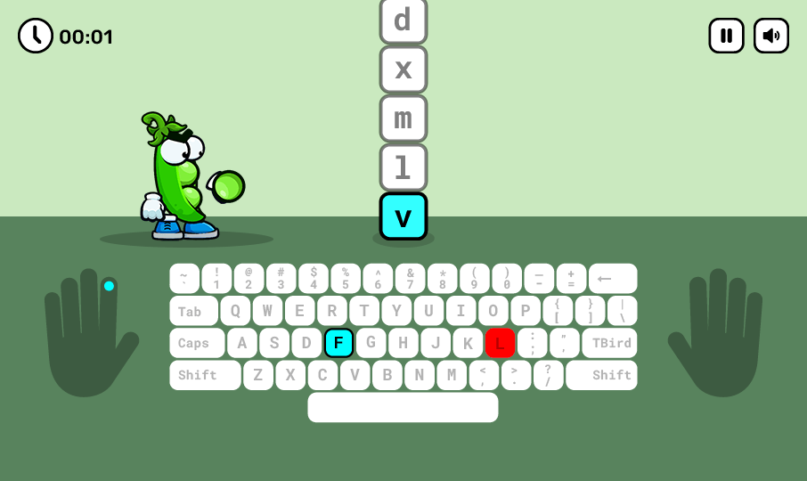 - Once the game begins, a pea character appears on screen. The letters to type are stacked up in a vertical bar in front of it.Â